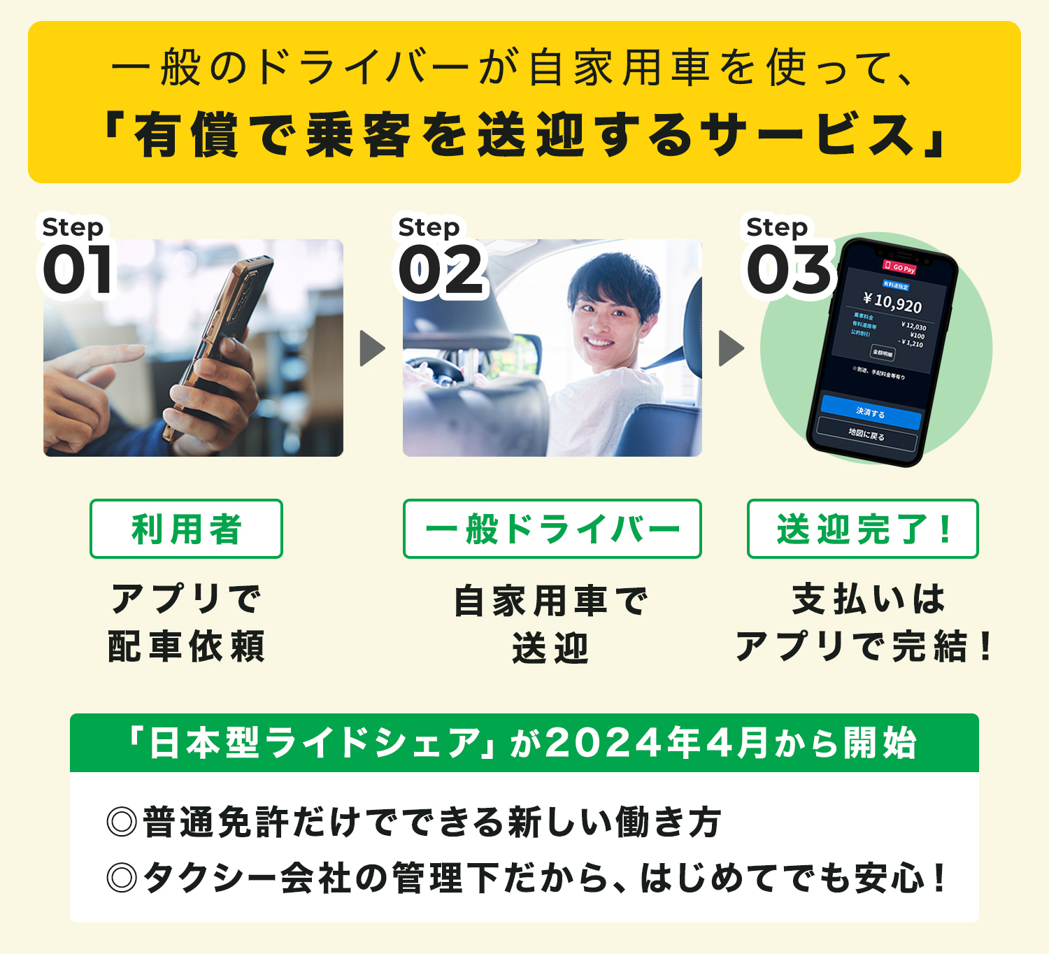 日本型ライドシェアでは、タクシー会社の管理のもと、一般ドライバーが自家用車を利用して有料で乗客を送迎することが可能になりました。