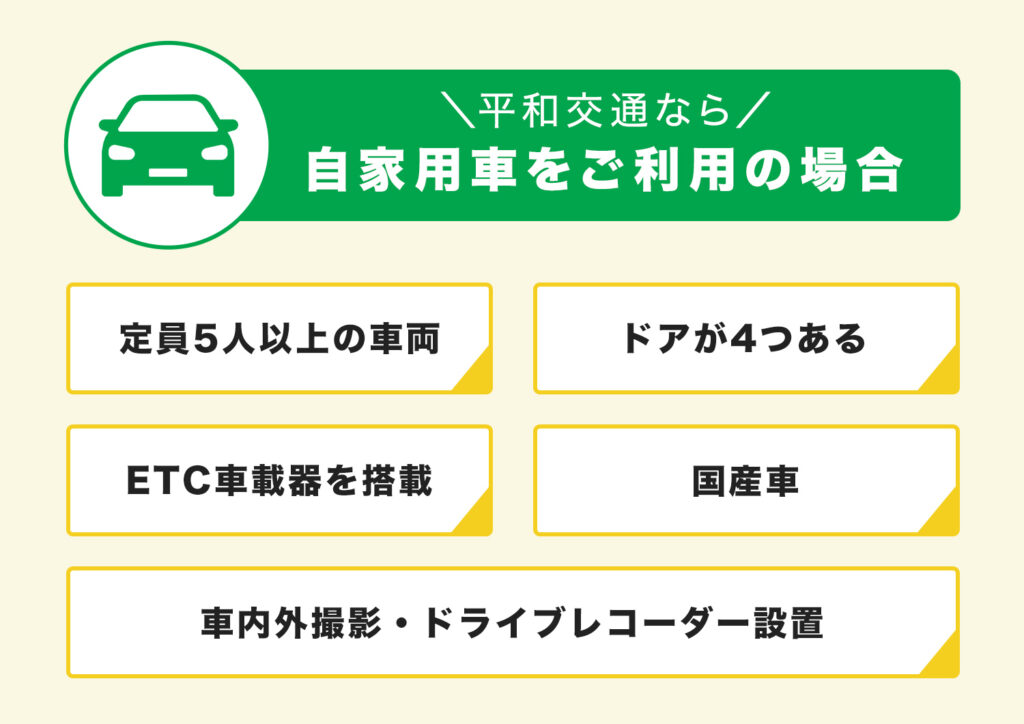 タクシー会社ごとに詳細な条件は異なるため、事前に確認しましょう。なお、平和交通で自家用車をご利用の場合は、下記の条件に当てはまっていることが必須条件です。