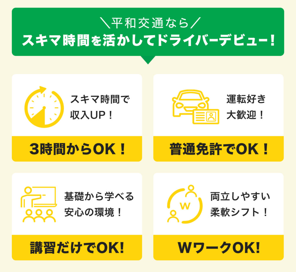 平和交通では、以下の内容でライドシェアのドライバーを募集しています。