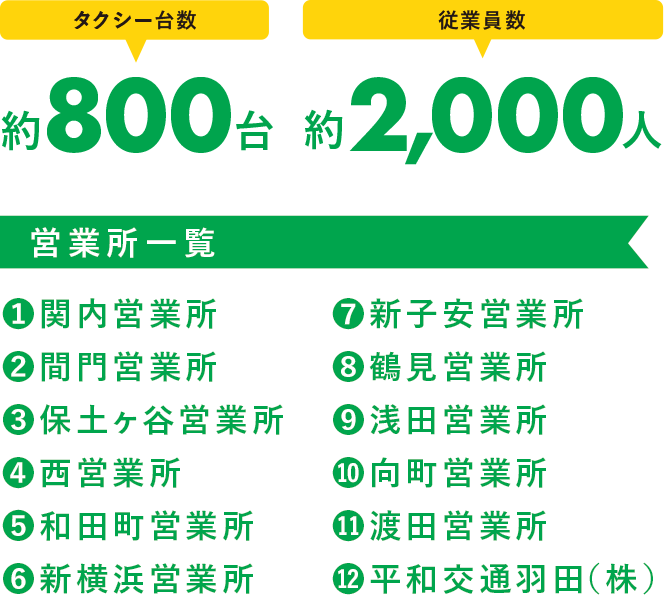 No.1タクシー会社約800台のタクシーと、2,000名の社員を擁する大手タクシー事業者です。京浜交通圏では、当社の規模がNo.1となるんです。